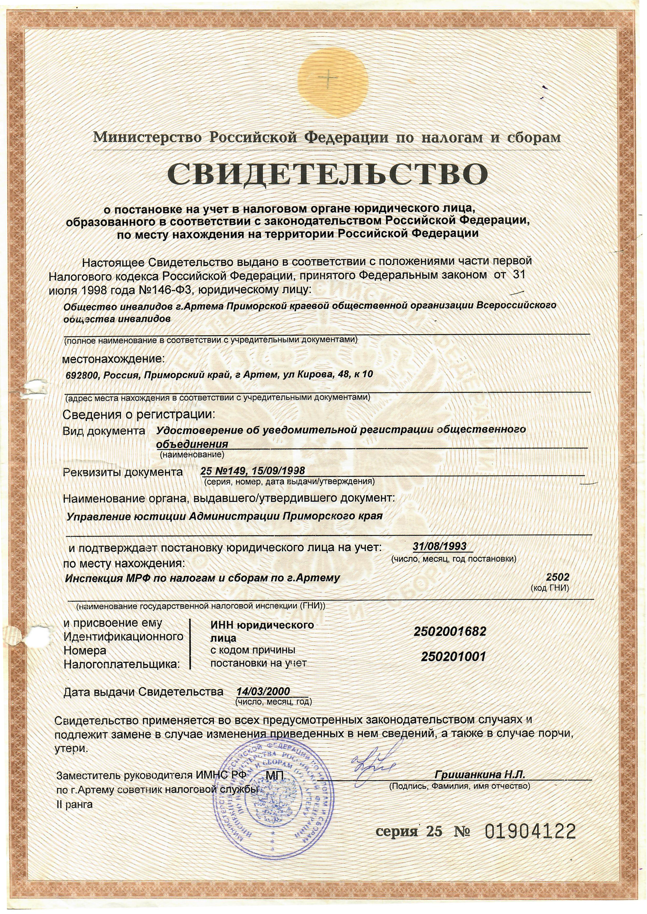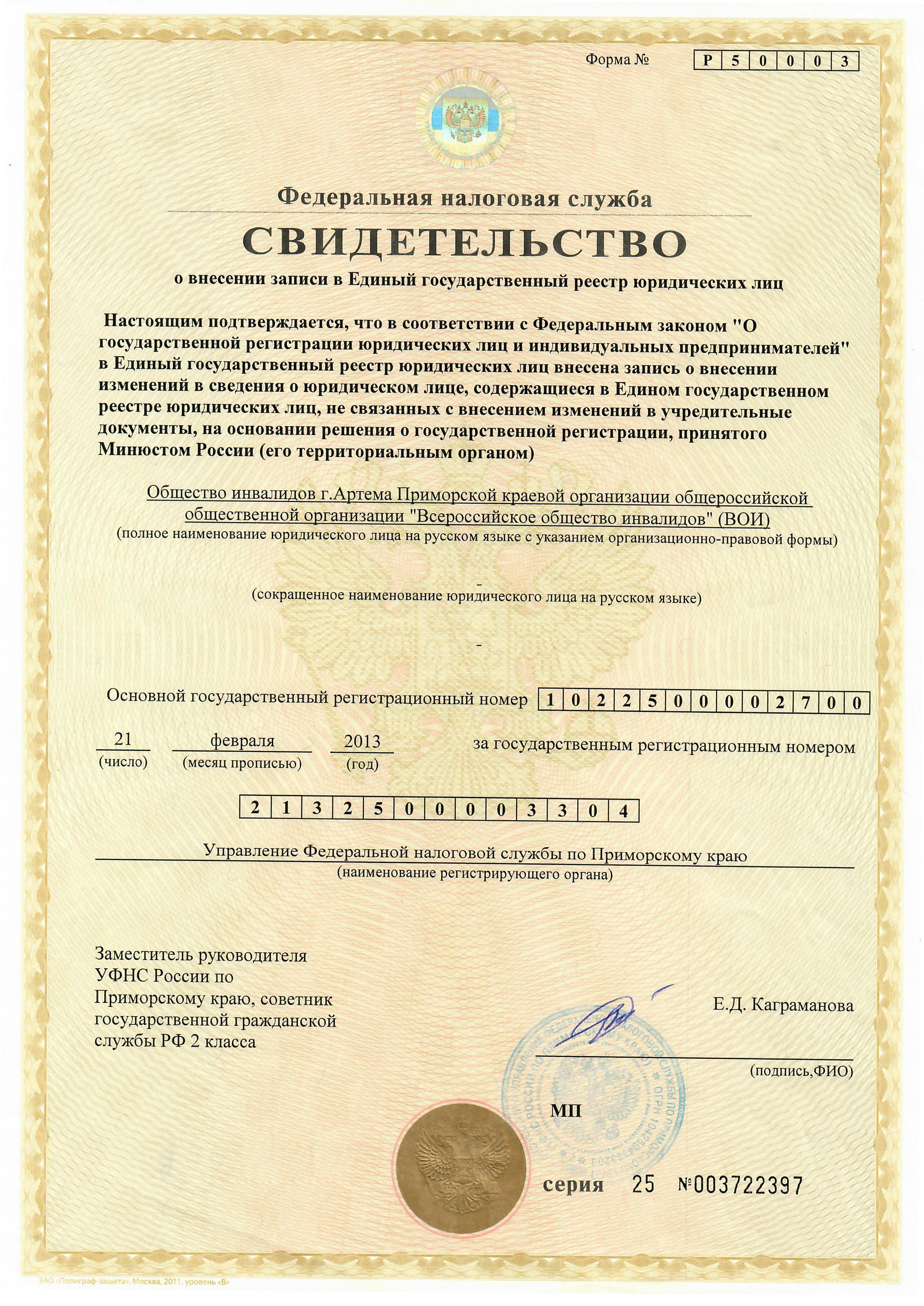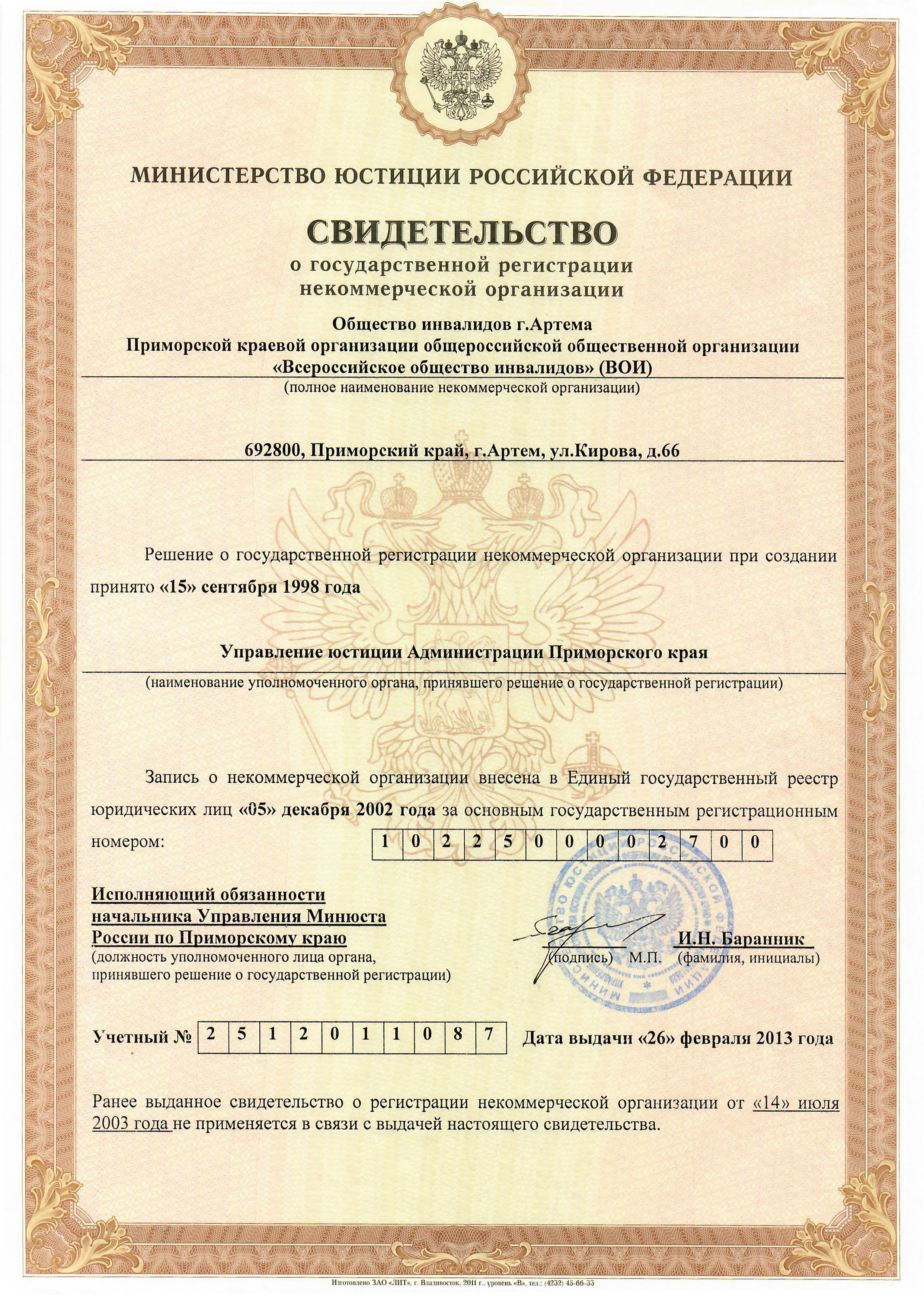 Полное наименование организации: Общество инвалидов г. Артёма Приморской краевой организации общероссийской общественной организации «Всероссийское общество инвалидов» (ВОИ).